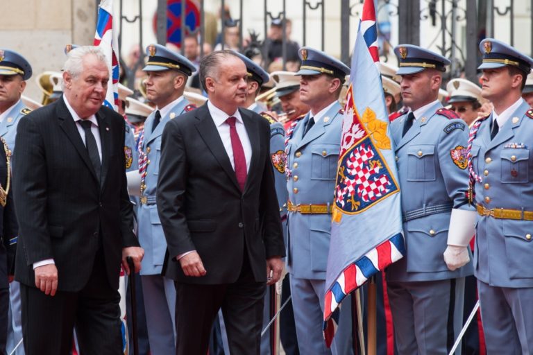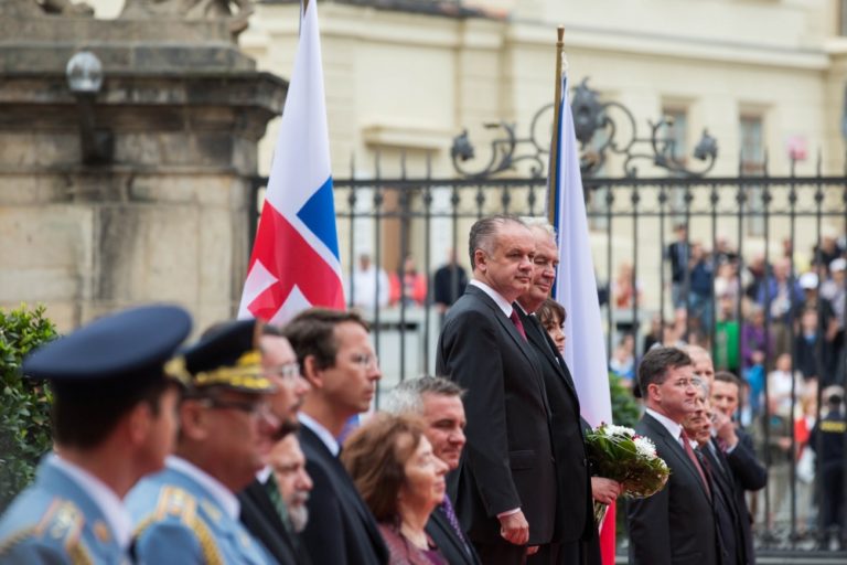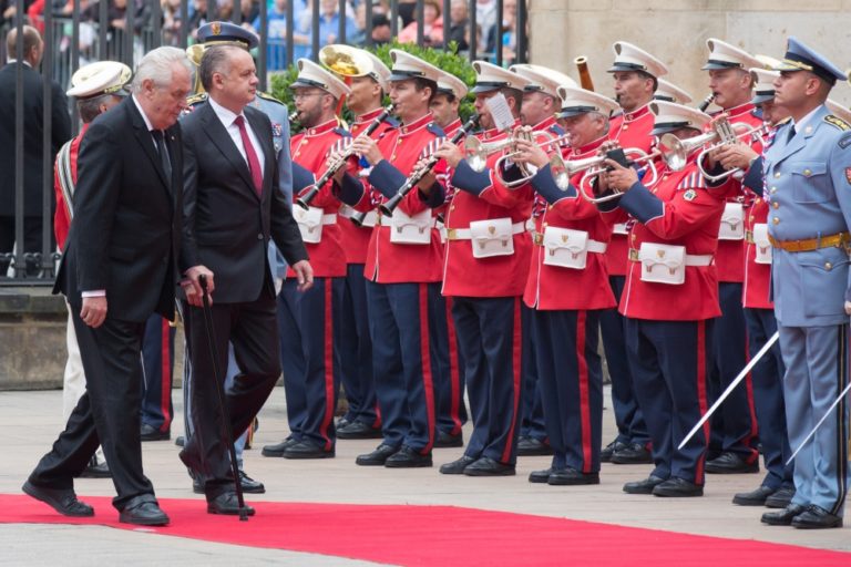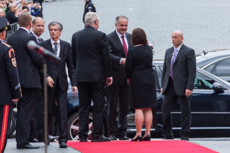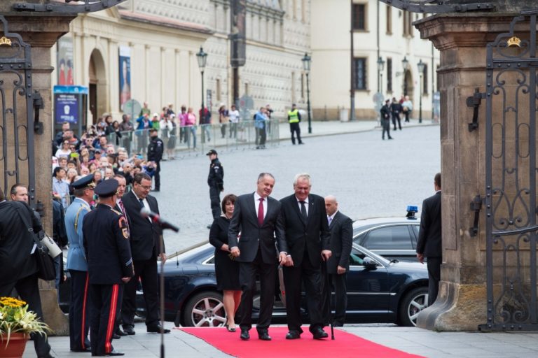 Uprostred sprava: Prezident ČR Miloš Zeman a prezident SR Andrej Kiska počas oficiálneho privítacieho ceremoniálu pri príležitosti návštevy prezidenta SR v Českej republike. Praha, Česká republika, 9. júl 2014. Foto: SITA/Jozef Jakubčo