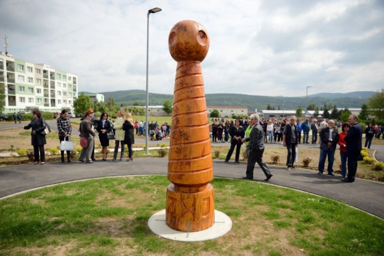 Obelisk Nádej od rezbára Andreja Jánošku v novej oddychovej zóne Etapa v Žiari nad Hronom pred slávnostným otvorením za účasti prezidenta Andreja Kisku. Žiar nad Hronom, 18. máj 2016. Foto: SITA/Jakub Julény