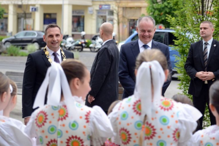 Andrej Kiska a primátor mesta Žiar nad Hronom Peter Antal počas pracovného výjazdu prezidenta v Žiari nad Hronom. Žiar nad Hronom, 18. máj 2016 Foto: SITA/Jakub Julény