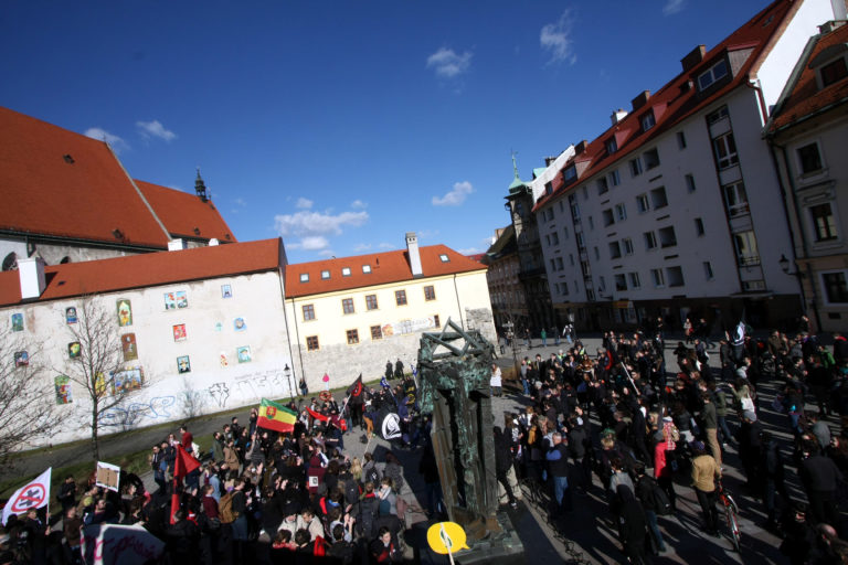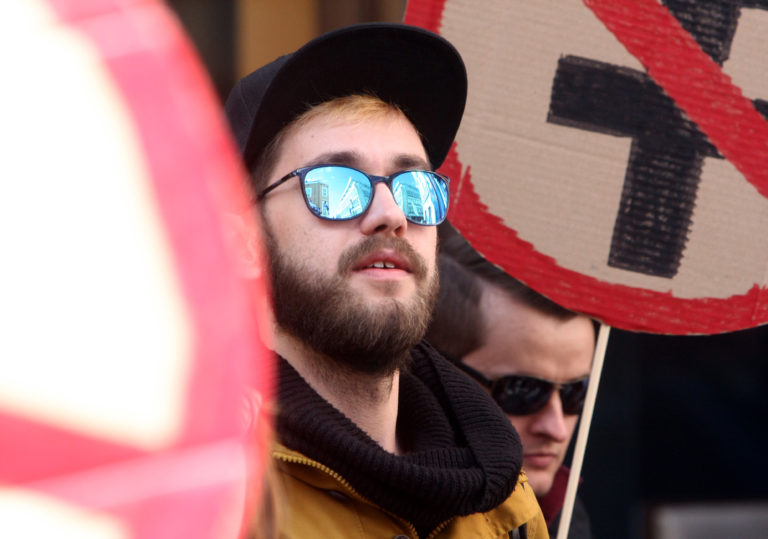 Pohľad na transparent počas podujatia Antifašistická demonštrácia - vyvrcholenie série antifašistických podujatí pod názvom Antifašistická mobilizácia. Bratislava, 11. marec 2017. foto: SITA/Peter Maďar