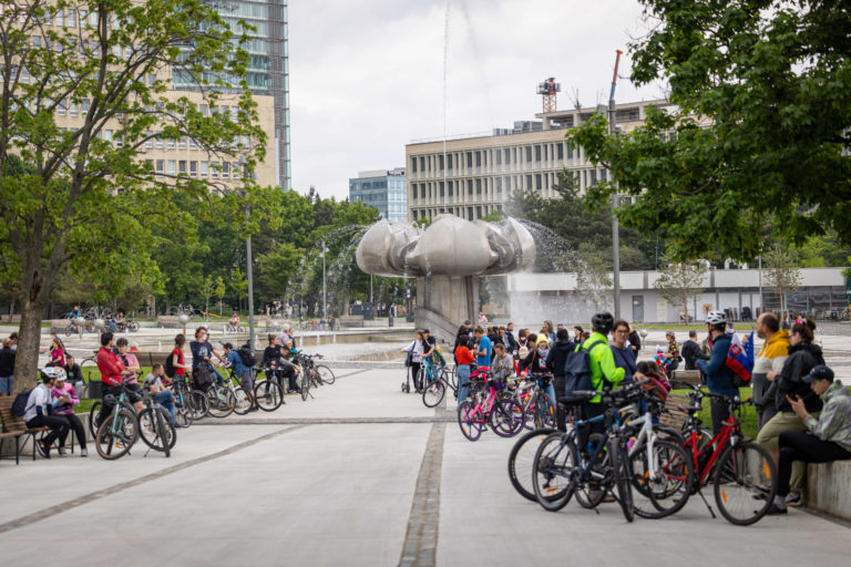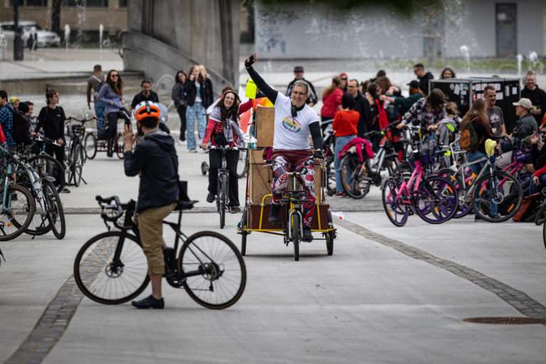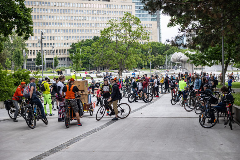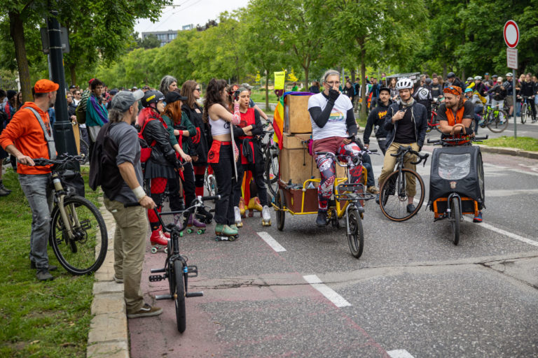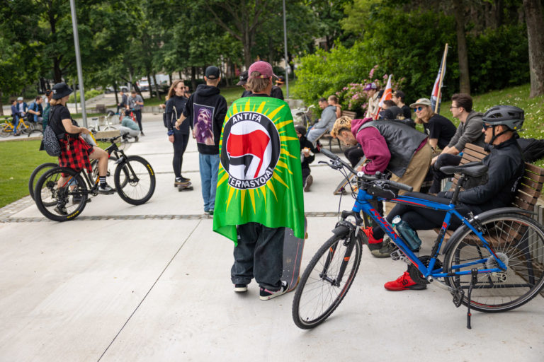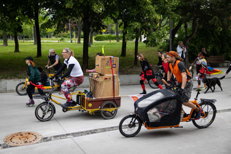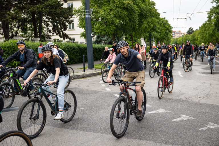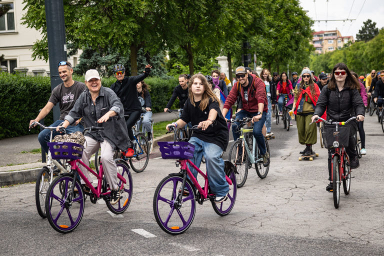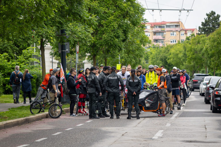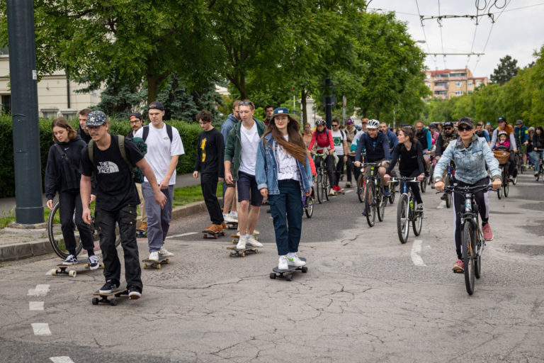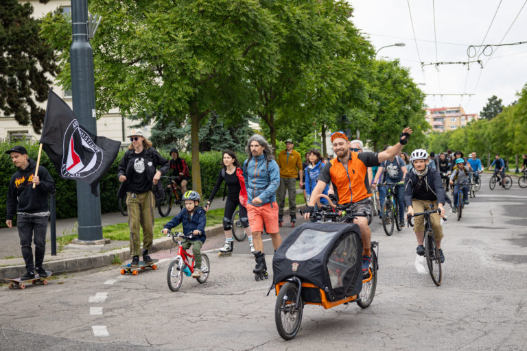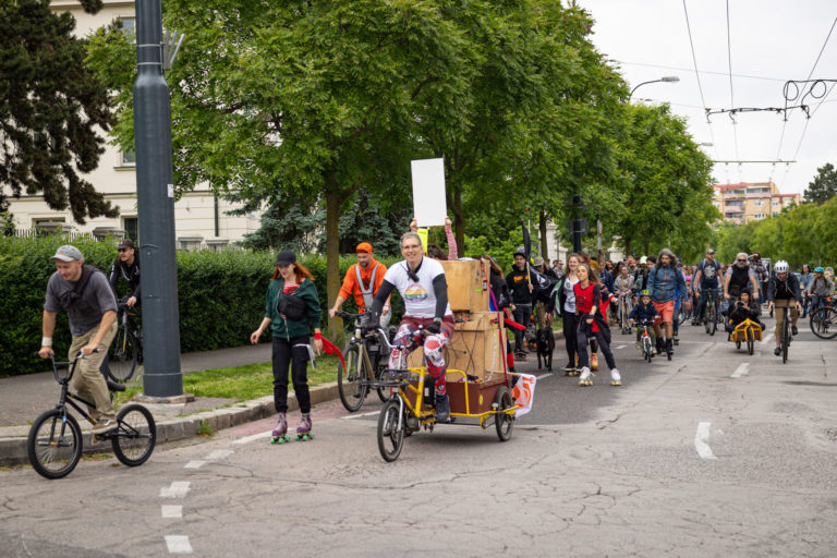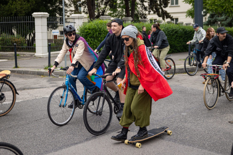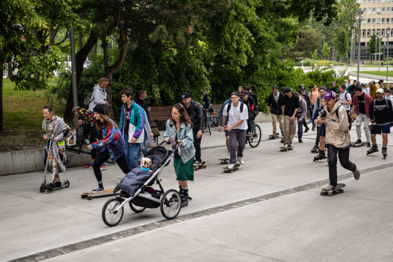 Účastníci počas Antifašistického pojazdu Bratislavou organizovaného Asociáciou downhill skateboardingu v rámci Dňa víťazstva nad fašizmom. Bratislava, 8. máj 2024. Foto: SITA/Jana Birošová