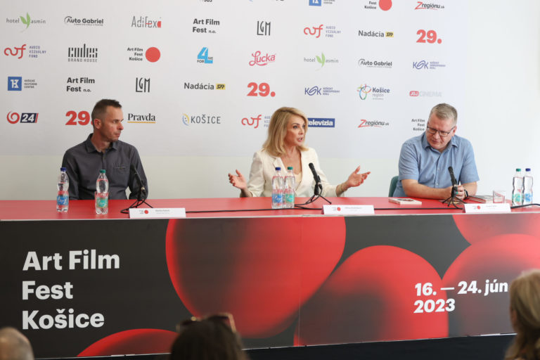 Zľava: umelecký riaditeľ festivalu Martin Palúch, herečka Zdena Studenková a hovorca festivalu Juraj Čurný na tlačovej konferencii Hercova misia v košickom Kulturparku počas Art Film Festu Košice 2023. Košice, 17. jún 2023. Foto: SITA/Marek Lukáč.