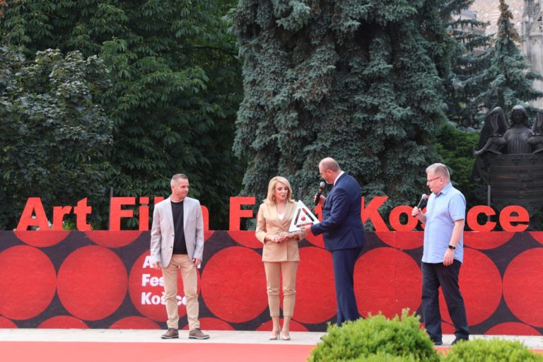 Zľava: hovorca Art Film Fest Košice 2023 Juraj Čurný, umelecký riaditeľ festivalu Martin Palúch, herečka Eva Holubová a primátor Košíc Jaroslav Polaček  počas odovzdávania ceny Hercová misia na Dolnej bráne v Košiciach. Košice, 22. jún 2023. Foto: SITA/Marek Lukáč