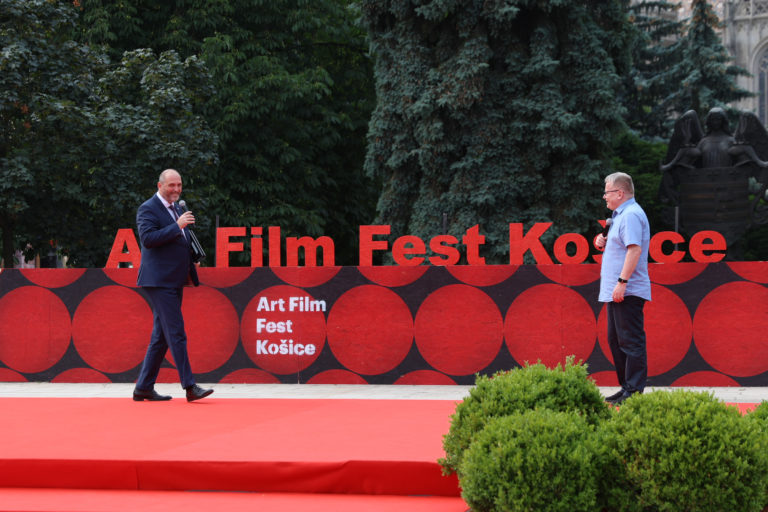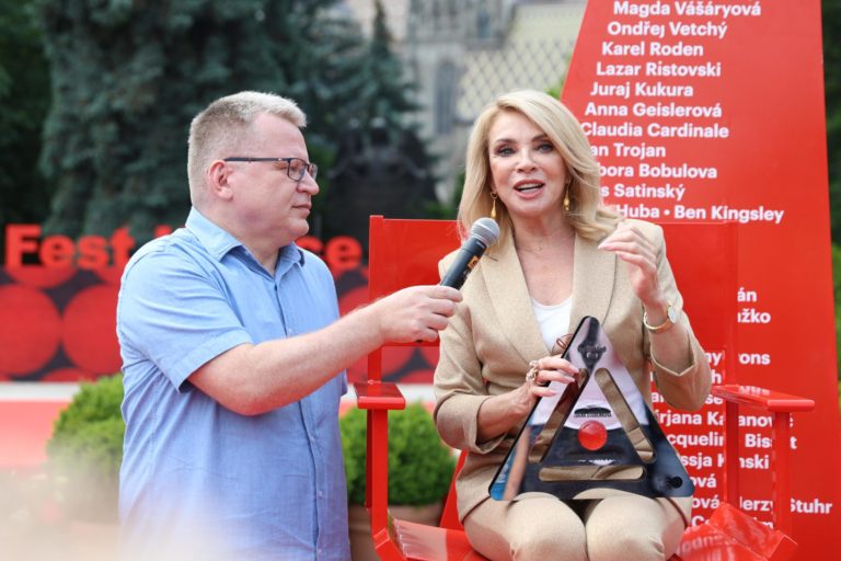 Zľava: Hovorca Art Film Fest Košice 2023 Juraj Čurný a herečka Zdena Studenková počas odovzdávania ceny Hercová misia na Dolnej bráne v Košiciach. Košice, 17. jún 2023. Foto: SITA/Marek Lukáč.