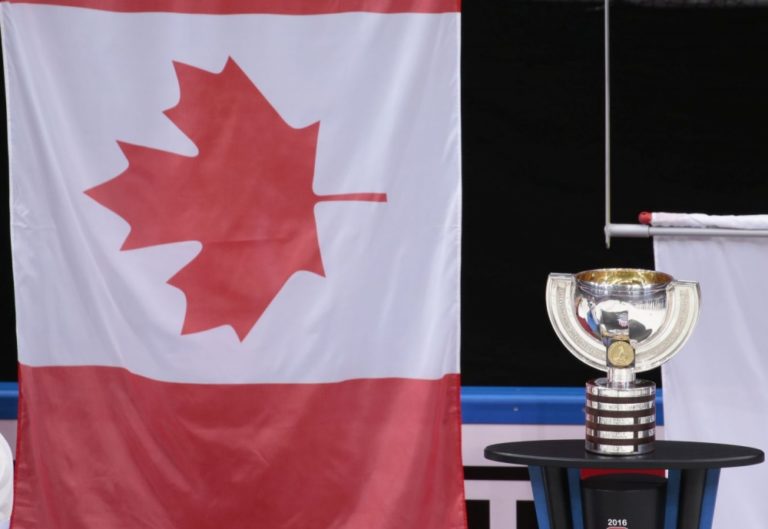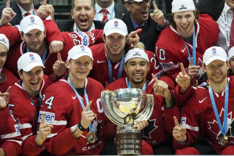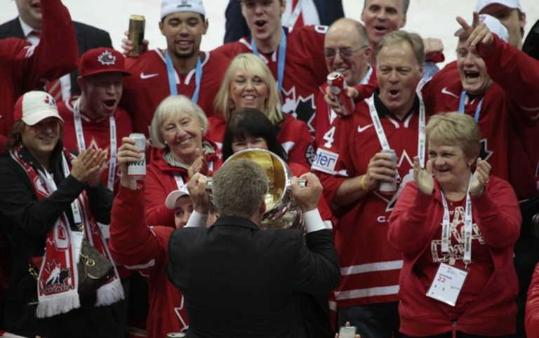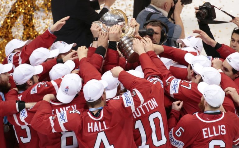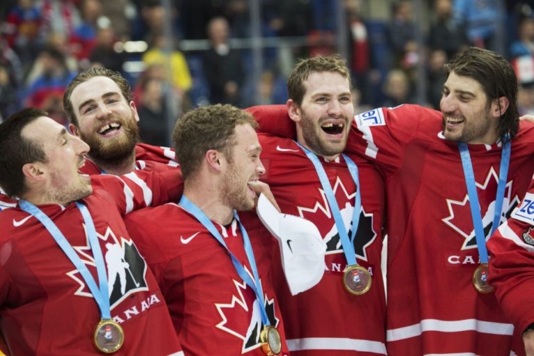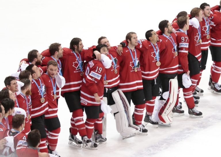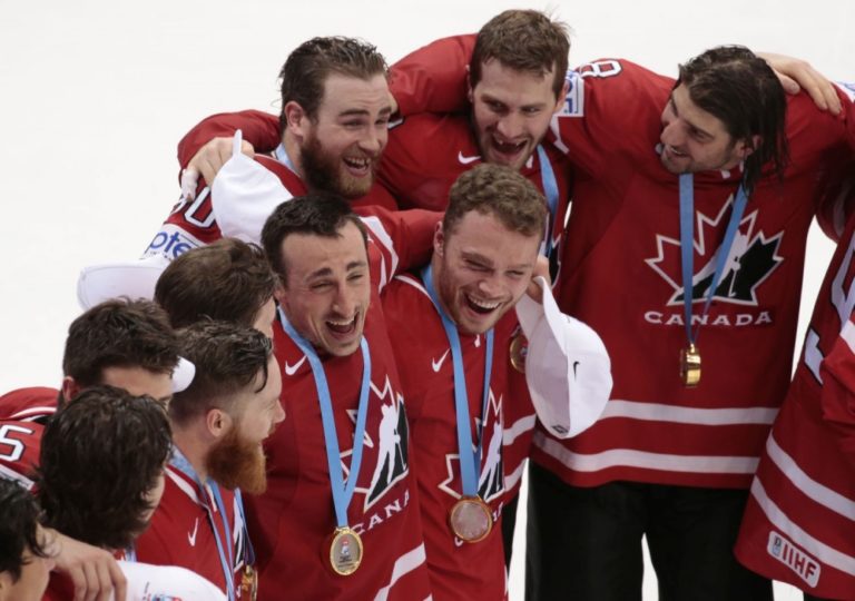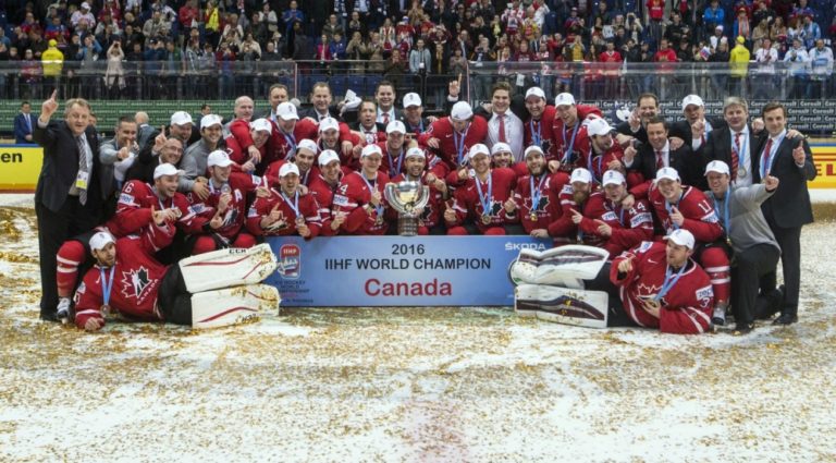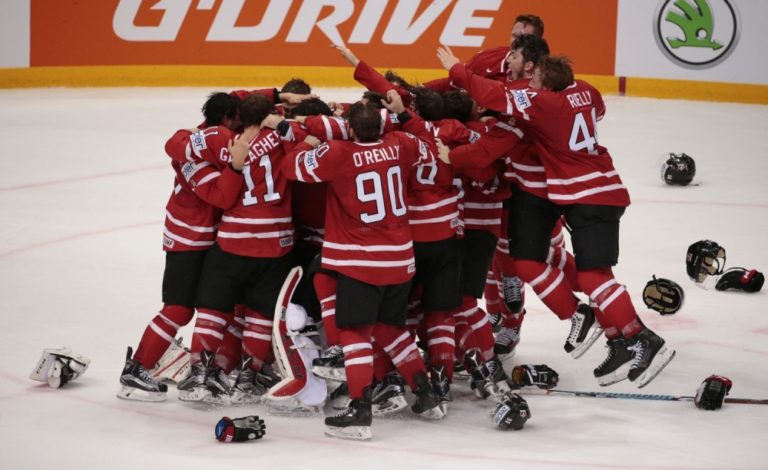 Kanadskí hokejisti spievajú hymnu po finálovom zápase na svetovom šampionáte v Rusku, v ktorom zdolali Fínov. Moskva, 22. máj 2016 Foto: SITA/AP