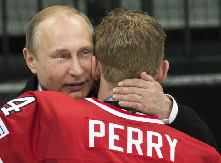 Ruský prezident Vladimir Putin a kanadský kapitán Corey Perry po finálovom zápase na svetovom šampionáte v hokeji. Moskva, 22. máj 2016. Foto: SITA/AP