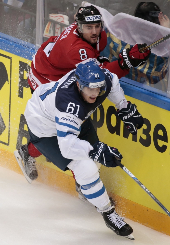 Kanaďan Boone Jenner v súboji s fínskym útočníkom Mikaelom Granlundom počas finálového zápasu na svetovom šampionáte v Rusku. Moskva, 22. máj 2016. Foto: SITA/AP