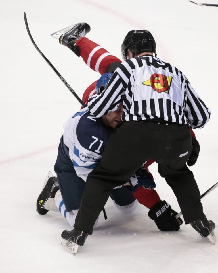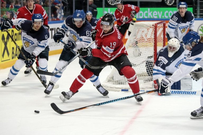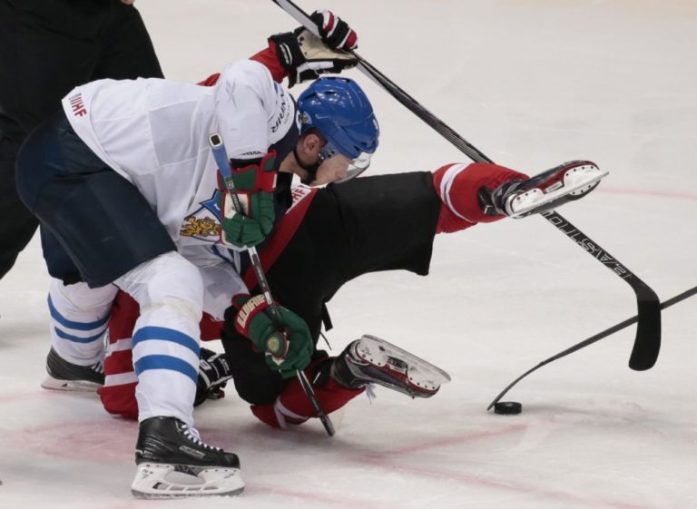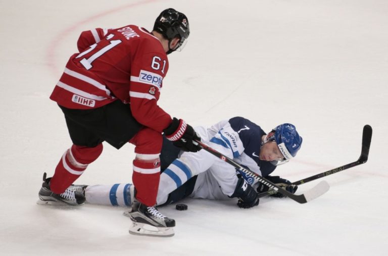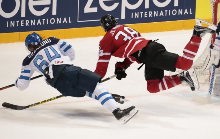 Kanadský útočník Derick Brassard v súboji s hokejistami Fínska počas finálového zápasu na svetovom šampionáte v Rusku. Moskva, 22. máj 2016. Foto: SITA/AP
