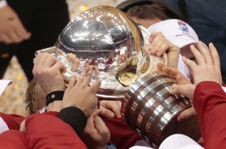 Radosť kanadských hokejistov s víťaznou trofejou po finálovom zápase na svetovom šampionáte v Rusku, v ktorom zdolali Fínov. Moskva, 22. máj 2016 Foto: SITA/AP