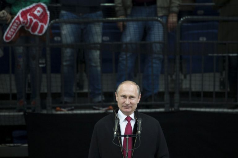 Príhovor ruského prezidenta Vladimira Putina po finálovom zápase na svetovom šampionáte, v ktorom Kanada zdolala Fínsko 2:0. Moskva, 22. máj 2016. Foto: SITA/AP