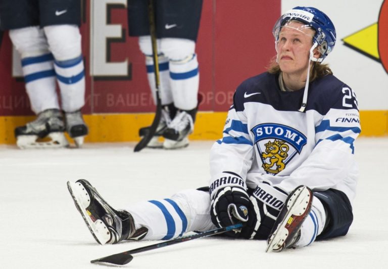 Smutný mladý fínsky útočník Patrik Laine po finálovom zápase na svetovom šampionáte v hokeji, v ktorom reprezentácia Suomi podľahla Kanade 0:2. Moskva, 22. máj 2016. Foto: SITA/AP