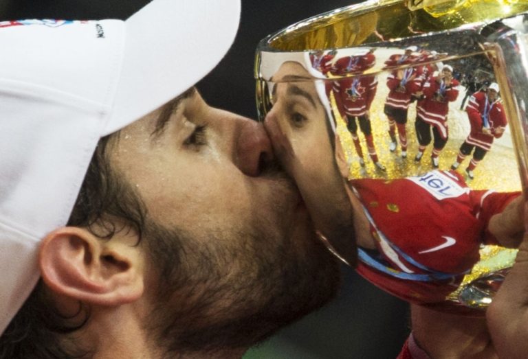 Kanadský kapitán Corey Perry s víťaznou trofejou po finálovom zápase na svetovom šampionáte v Rusku, v ktorom jeho tím zdolal Fínov 2:0. Moskva, 22. máj 2016 Foto: SITA/AP
