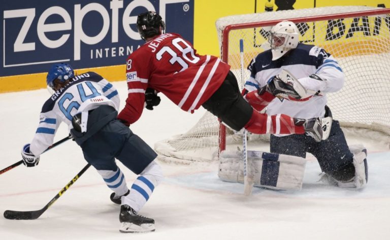 Kanaďan Boone Jenner v súboji s fínskym útočníkom Mikaelom Granlundom pred brankárom Mikkom Koskinenom počas finálového zápasu na svetovom šampionáte v Rusku. Moskva, 22. máj 2016. Foto: SITA/AP