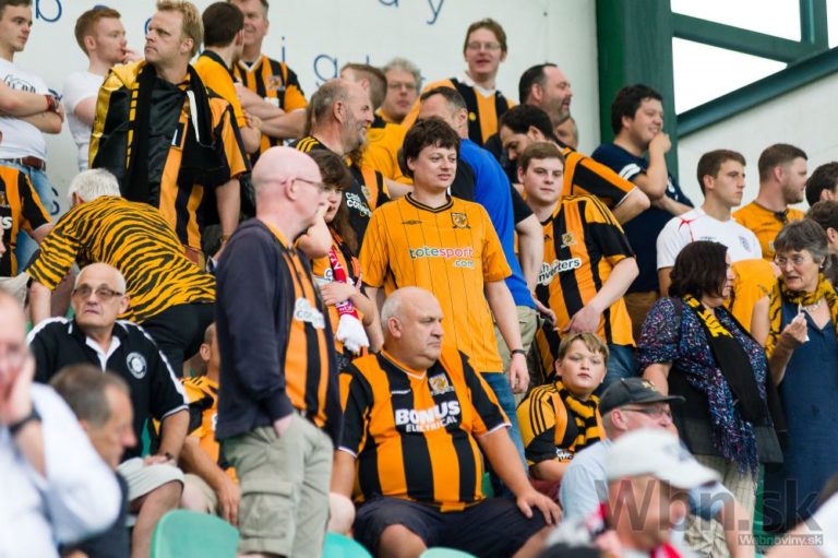 Fanúšikovia Hull City počas zápasu 3. predkola Európskej ligy 2014/2015 medzi AS Trenčín (SR) a Hull City (Angl.). Žilina, 31. júl 2014. Foto: SITA/Milo Fabian
