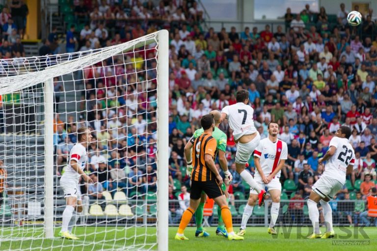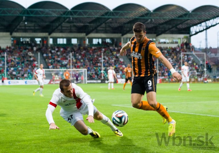 Zľava: Peter Kleščík z AS Trenčín a Shane Long z Hull City počas zápasu 3. predkola Európskej ligy 2014/2015 medzi AS Trenčín (SR) a Hull City (Angl.). Žilina, 31. júl 2014. Foto: SITA/Milo Fabian