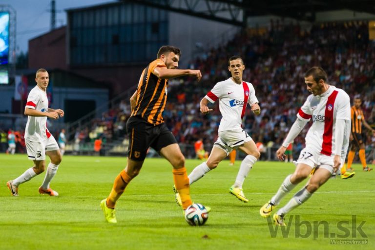 Zľava: Shane Long z Hull City, Patrik Mišák, Peter Kleščík a Ramón da Silva zo Žiliny počas zápasu 3. predkola Európskej ligy 2014/2015 medzi AS Trenčín (SR) a Hull City (Angl.). Žilina, 31. júl 2014. Foto: SITA/Milo Fabian