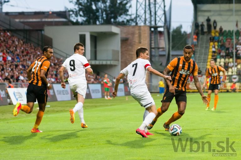 Zľava: Mohamed Essa z Hull City a Milan Rundić z AS Trenčín počas zápasu 3. predkola Európskej ligy 2014/2015 medzi AS Trenčín (SR) a Hull City (Angl.). Žilina, 31. júl 2014. Foto: SITA/Milo Fabian