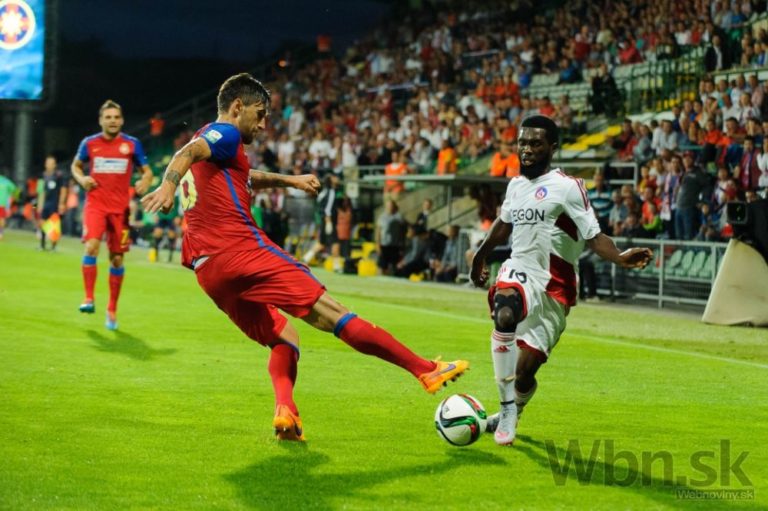 Zľava: Paul Papp z FC Steaua Bukurešť a Dávid Guba z FK AS Trenčín počas zápasu medzi FK AS Trenčín - FC Steaua Bukurešť. Žilina, 14. júl 2015. Foto: SITA/Milo Fabian