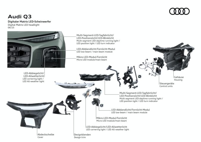 Na obrázku je zobrazený rozobratý pohľad na komponenty digitálneho Matrix LED svetlometu vrátane podrobného zobrazenia polohy jednotlivých svetelných funkcií. Foto: Audi