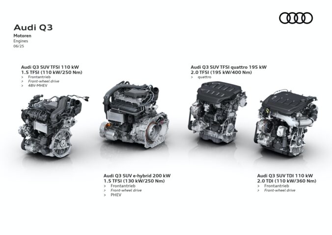 Na obrázku je znázornená ponuka motorov, ktoré sú k dispozícii v Audi Q3. Zľava doprava: 1.5 TFSI s výkonom 110 kW a 250 Nm s energetickým systémom 48V MHEV; verzia 1.5 TFSI e-hybrid so 130 kW a 250 Nm; 2.0 TFSI so 195 kW a 400 Nm; a 2.0 TDI so 110 kW a 360 Nm. Foto: Audi