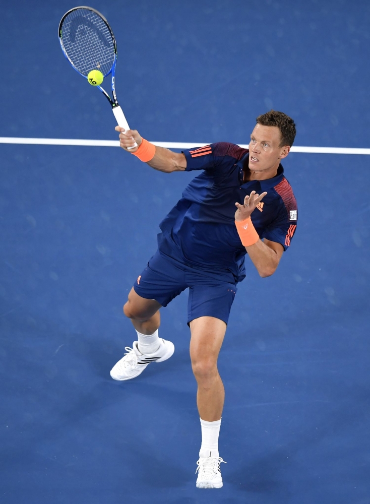 Český tenista Tomáš Berdych počas zápasu 3. kola Austrlalian Open, v ktorom nestačil na Švajčiara Rogera Federera 2:6, 4:6, 4:6. Melbourne, 20. január 2017. Foto: SITA/AP