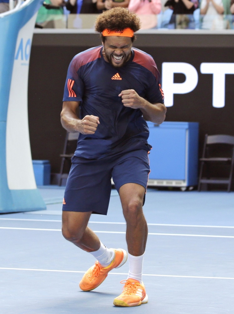 Francúzsky tenista Jo-Wilfried Tsonga počas zápasu 3. kola Australian Open, v ktorom zdolal Američana Jacka Socka 7:6 (4), 7:5, 6:7 (8), 6:3. Melbourne, 20. január 2017. Foto: SITA/AP