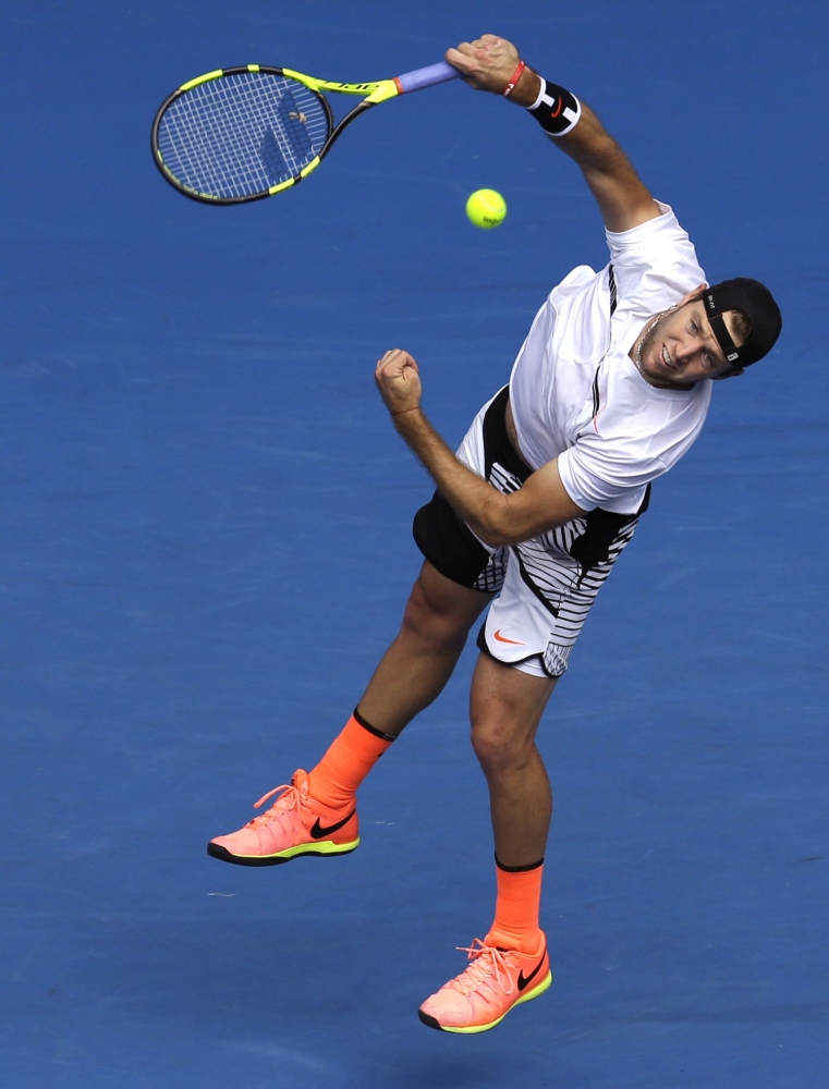 Americký tenista Jack Sock počas zápasu 3. kola Australian Open, v ktorom ho zdolal Francúz Jo-Wilfried Tsonga 7:6 (4), 7:5, 6:7 (8), 6:3. Melbourne, 20. január 2017. Foto: SITA/AP