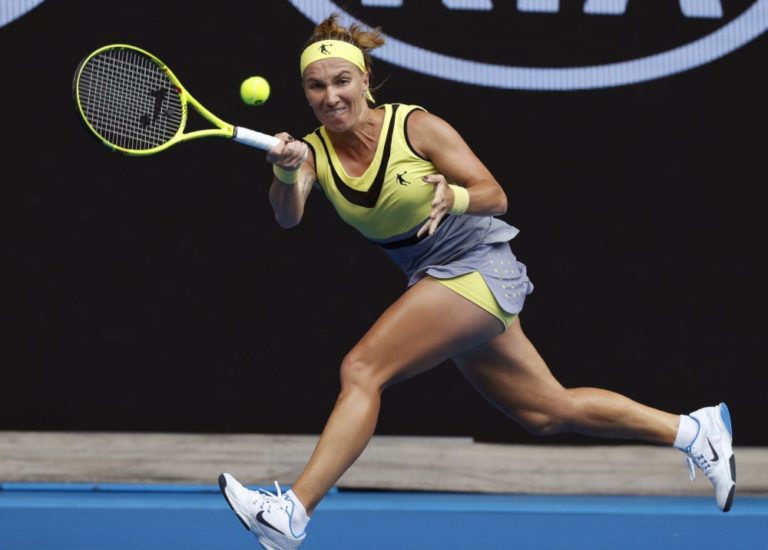 Ruská tenistka Anastasia Pavľučenkovová počas zápasu 3. kola Australian Open, v ktorom zdolala Ukrajinku Elinu Svitolinovú 7:5, 4:6, 6:3. Melbourne, 20. január 2017. Foto: SITA/AP