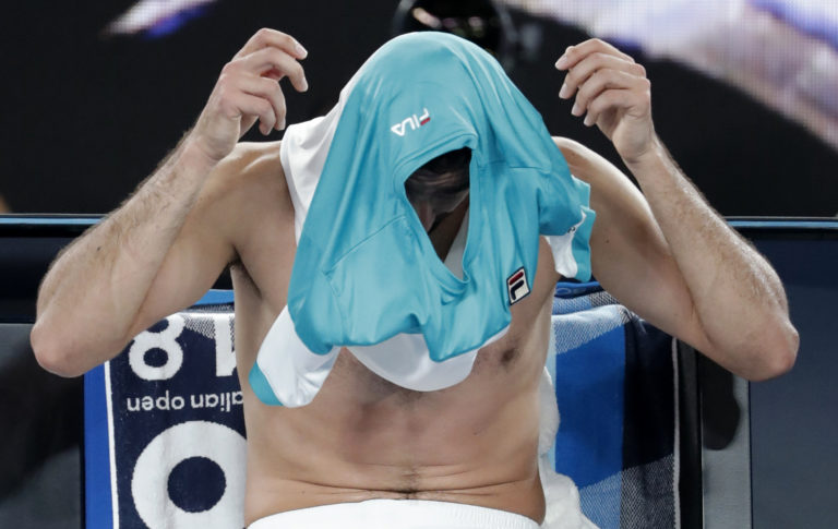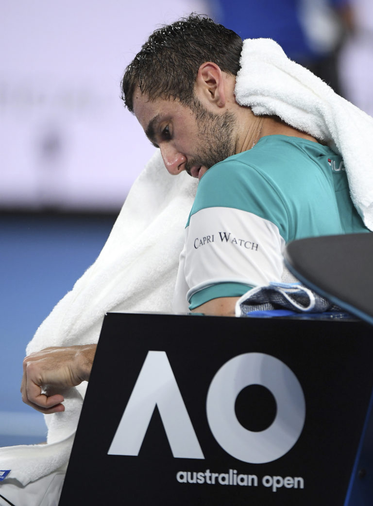 Croatia's Marin Cilic wipes his head during a break while playing Switzerland's Roger Federer during the men's singles final at the Australian Open tennis championships in Melbourne, Australia, Sunday, Jan. 28, 2018. (AP Photo/Andy Brownbill) Foto: SITA/AP.