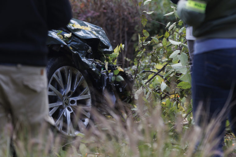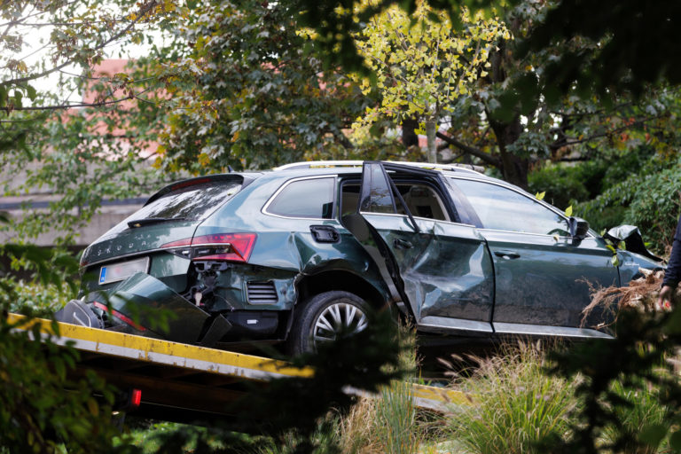 Osobné vozidlo na mieste tragickej dopravnej nehody na Zochovej ulici v Bratislave, ktorým vodič narazil 2. októbra 2022 po 22:15 do zastávky mestskej hromadnej dopravy (MHD). Bratislava, 3. október 2022. Foto: SITA/Branislav Bibel.