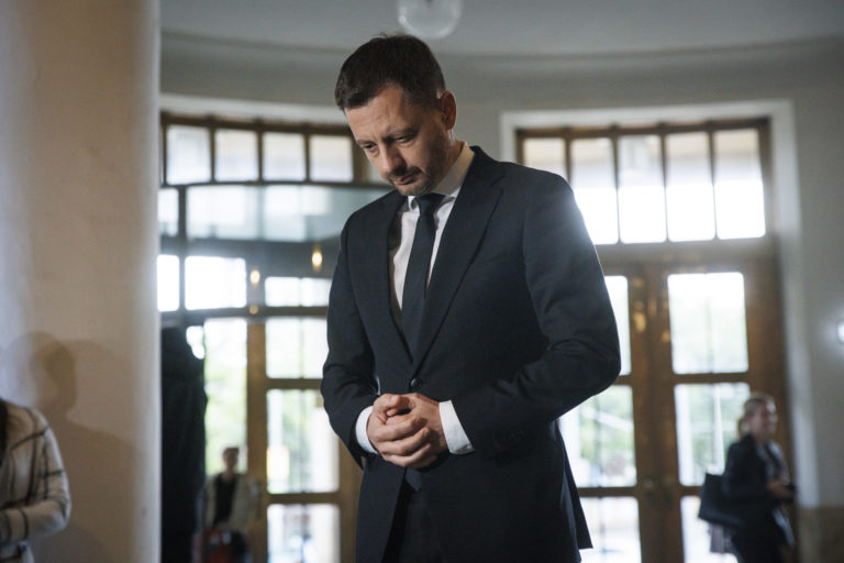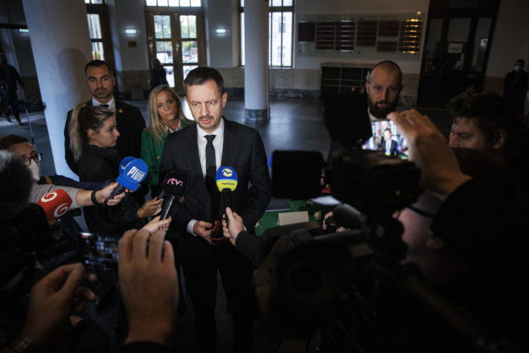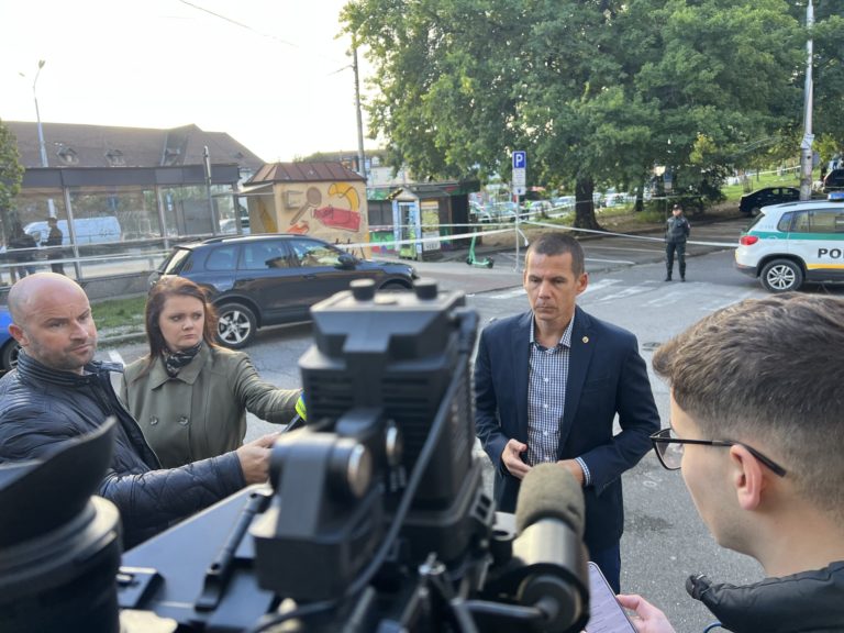 Premiér Eduard Heger počas brífingu po zápise do kondolenčných kníh na pamiatku obetí tragickej dopravnej nehody, ktorá si doteraz vyžiadala 5 obetí a viacero zranených mladých ľudí na zastávke mestskej hromadnej dopravy Zochova v Starom Meste. Bratislava, 3. október 2022. Foto: SITA/Branislav Bibel.
