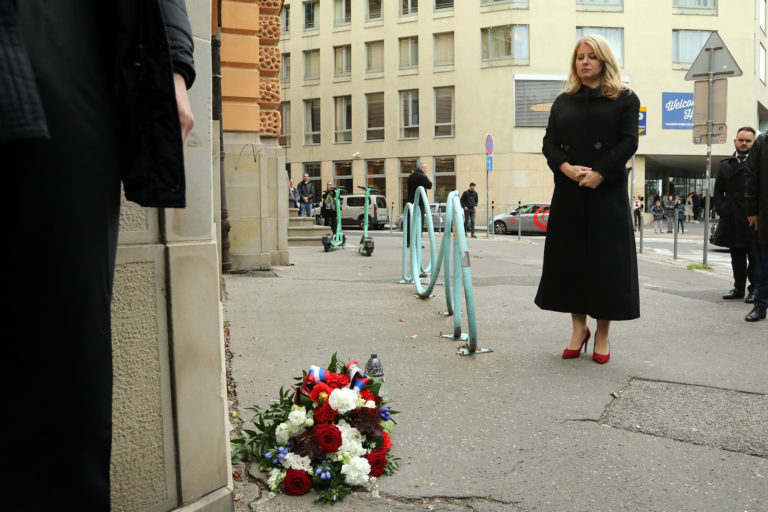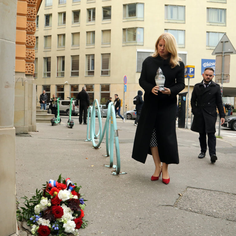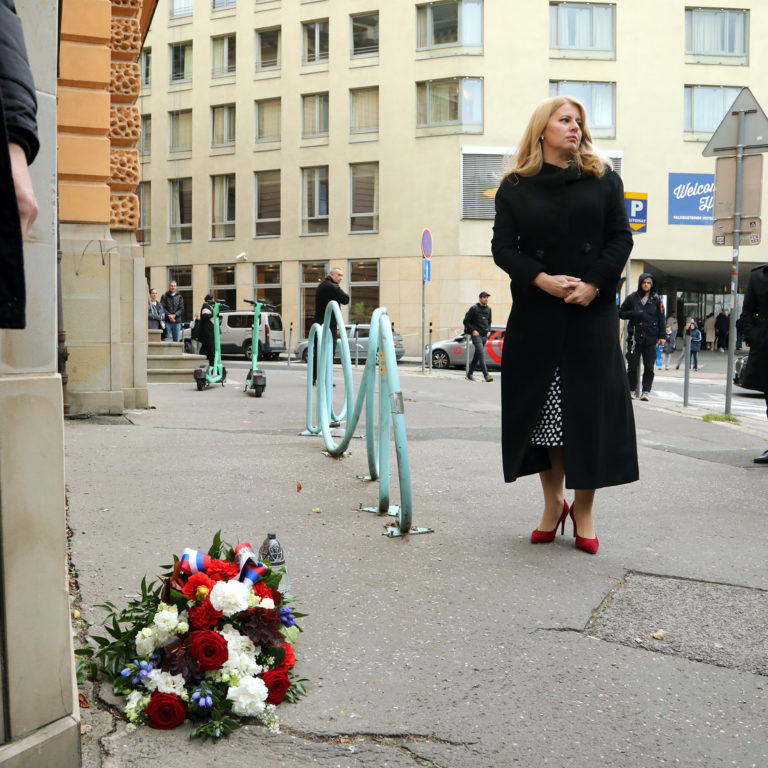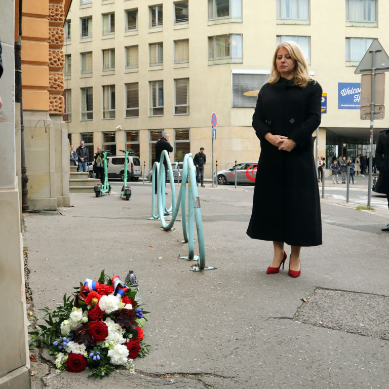 Prezidentka Zuzana Čaputová si uctila pamiatku obetí tragickej dopravnej nehody položením kvetov a zapálením sviečky neïaleko zastávky Zochova v Bratislave. Do zastávky mestskej hromadnej dopravy (MHD) plnej ľudí nabúral 2. októbra 2022 po 22:15 vodič osobného auta. Bratislava, 3. október 2022. Foto: SITA/Kancelária prezidentky SR.