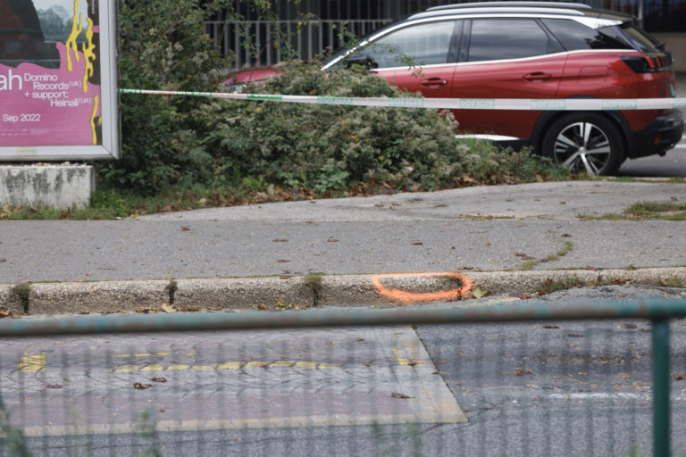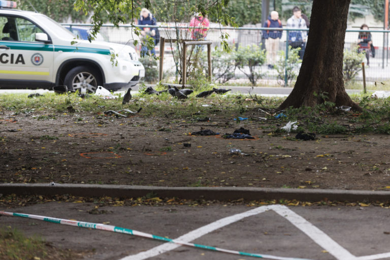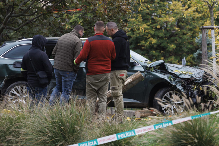 Policajti dokumentujú okolnosti tragickej dopravnej nehody, ktorá sa stala 2. októbra 2022 po 22:15 na Zochovej ulici v Bratislave. Do zastávky mestskej hromadnej dopravy (MHD) narazilo osobné auto. Bratislava, 3. október 2022. Foto: SITA/Branislav Bibel.
