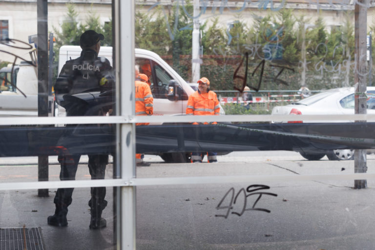 Policajt na mieste tragickej dopravnej nehody, ktorá sa stala 2. októbra 2022 po 22:15 na Zochovej ulici v Bratislave. Do zastávky mestskej hromadnej dopravy (MHD) narazilo osobné auto. Bratislava, 3. október 2022. Foto: SITA/Branislav Bibel.