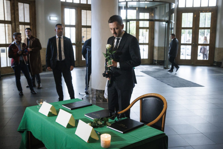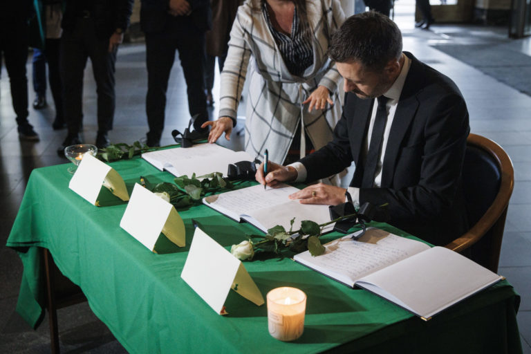 Premiér Eduard Heger počas zápisu do kondolenčných kníh na pamiatku obetí tragickej dopravnej nehody, ktorá si doteraz vyžiadala 5 obetí a viacero zranených mladých ľudí na zastávke mestskej hromadnej dopravy Zochova v Starom Meste. Bratislava, 3. október 2022. Foto: SITA/Branislav Bibel.