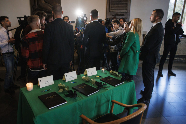 Premiér Eduard Heger (uprostred chrbtom) počas brífingu v priestoroch auly Univerzity Komenského v rámci uctenia si pamiatky obetí tragickej dopravnej nehody, ktorá si doteraz vyžiadala 5 obetí a viacero zranených mladých ľudí na zastávke mestskej hromadnej dopravy Zochova v Starom Meste. Bratislava, 3. október 2022. Foto: SITA/Branislav Bibel.