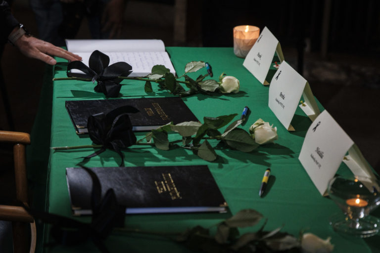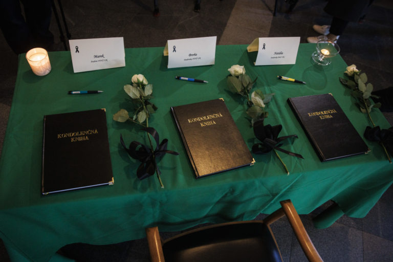Kondolenčnýé knihy v priestoroch auly Univerzity Komenského na pamiatku obetí tragickej dopravnej nehody, ktorá si doteraz vyžiadala 5 obetí a viacero zranených mladých ľudí na zastávke mestskej hromadnej dopravy Zochova v Starom Meste. Bratislava, 3. október 2022. Foto: SITA/Branislav Bibel.