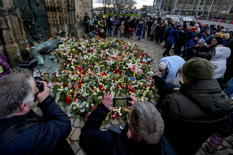 Ľudia kladú kvety a zapaľujú sviečky na mieste, kde sa konali vianočné trhy v nemeckom Magdeburgu, aby si uctili obete, ktoré zabil autom lekár zo Saudskej Arábie. Magdeburg, 21. december 2024. Foto: SITA/AP.