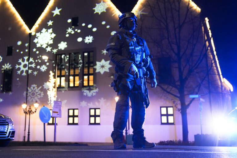 Policajt stráži miesto, kde došlo k útoku na viačných trhoch v nemeckom Magdeburgu. Lekár tu po 19:00 hod. autom zrazil ľudí, desiatky utrpeli zranenia a dvaja zahynuli. Magdeburg, 21. december 2024. Foto: SITA/AP.