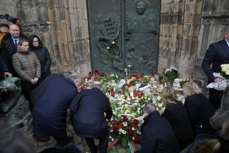Nemecký kancelár Olaf Scholz (uprostred vľavo) kladie kvety na pietne miesto pred katedrálu v nemeckom Magdeburgu, aby si uctil obete vianočných trhoch, ktoré zabil autom lekár zo Saudskej Arábie. Magdeburg, 21. december 2024. Foto: SITA/AP.