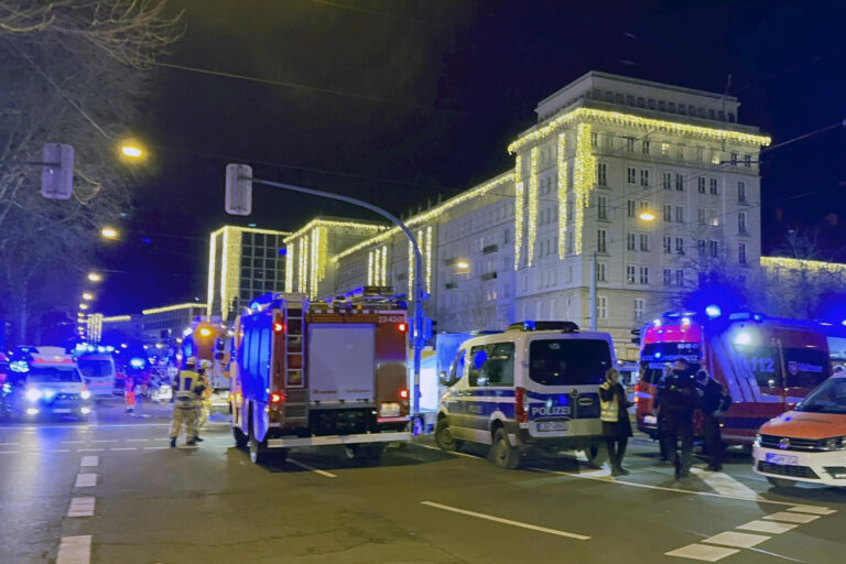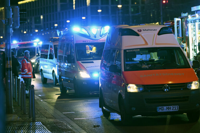 Sanitky stoja pri vianočných trhoch v nemeckom Magdeburgu, kde lekár autom vrazil do ľudí. Magdeburg, 20. decembra 2024 Foto: Heiko Rebsch/dpa via AP