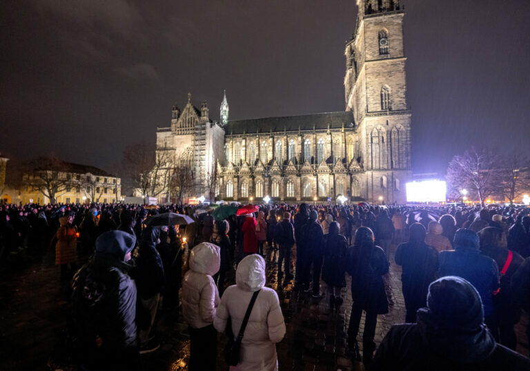 Ľudia stoja pred katedrálou v nemeckom Magdeburgu počas pobožnosti, na ktorej si pripomenuli obete, ktoré zabil autom na vianočných trhoch lekár zo Saudskej Arábie. Magdeburg, 21. december 2024. Foto: SITA/AP.