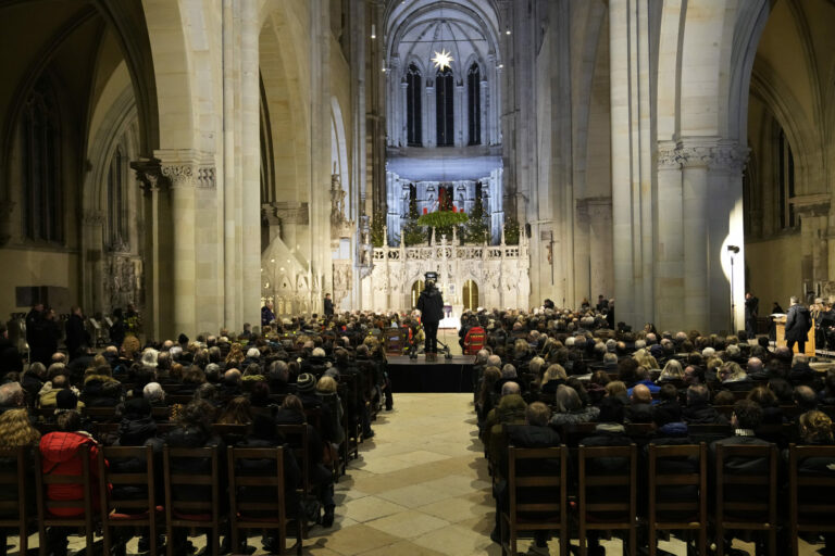 Sprava: Nemecký prezident Frank-Walter Steinmeier, nemecký kancelár Olaf Scholz počas pobožnosti v katedrále Magdeburgu, aby si uctili pamiatku obetí, ktoré autom zrazil na vianočných trhoch lekár zo Saudskej Arábie. Magdeburg, 21. december 2024 Foto: SITA/AP.