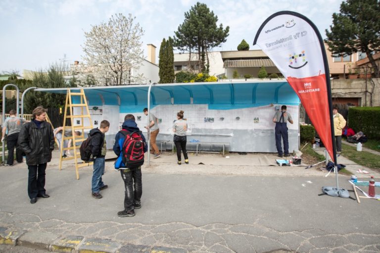 Členovia Mestského parlamentu mladých maľujú zastávku mestskej hromadnej dopravy (MHD) v rámci projektu Namaľuj CiTY! v mestskej časti Bratislava – Lamač. Bratislava, 2. apríl 2014.