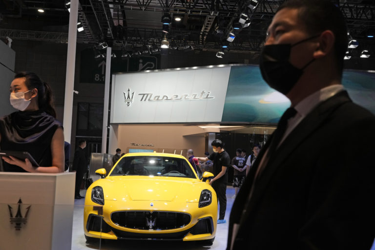 Pracovníci v stánku Maserati čakajú na návštevníkov počas autosalónu Auto Shanghai 2023 v Šanghaji, v stredu 19. apríla 2023. Foto: SITA/AP, Ng Han Guan