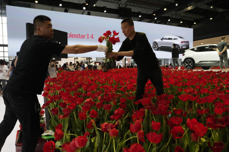 Pracovníci si podávajú kvety v stánku pre značku elektrických výkonných áut Polestar počas výstavy Auto Shanghai 2023 v Šanghaji, v stredu 19. apríla 2023. Foto: SITA/AP, Ng Han Guan