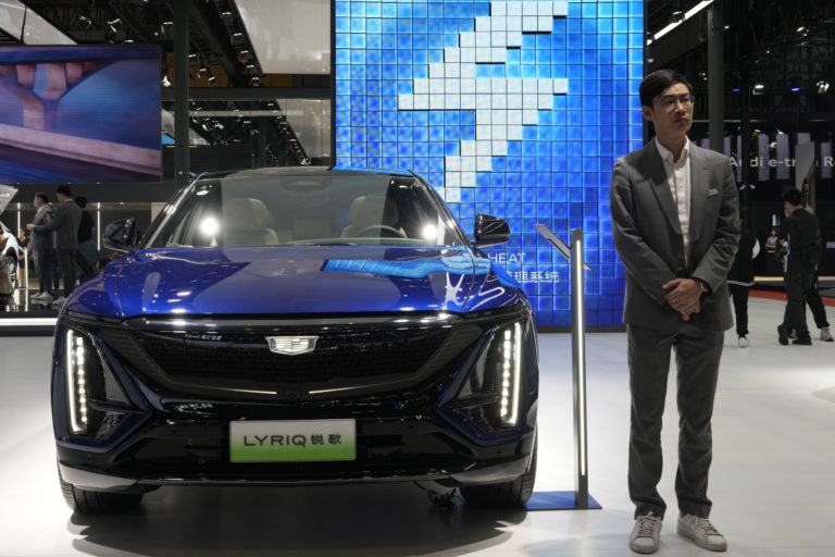 Promotér stojí pri plne elektrickom Lyriq od Cadillacu počas Auto Shanghai 2023 v Šanghaji v stredu 19. apríla 2023. Foto: SITA/AP, Ng Han Guan