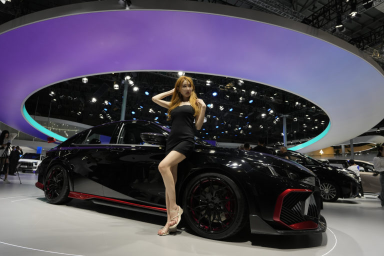 Modelka pózuje pri aute od čínskej automobilky GAC Trumpchi počas autosalónu Auto Shanghai 2023 v Šanghaji. Foto: SITA/AP, Ng Han Guan