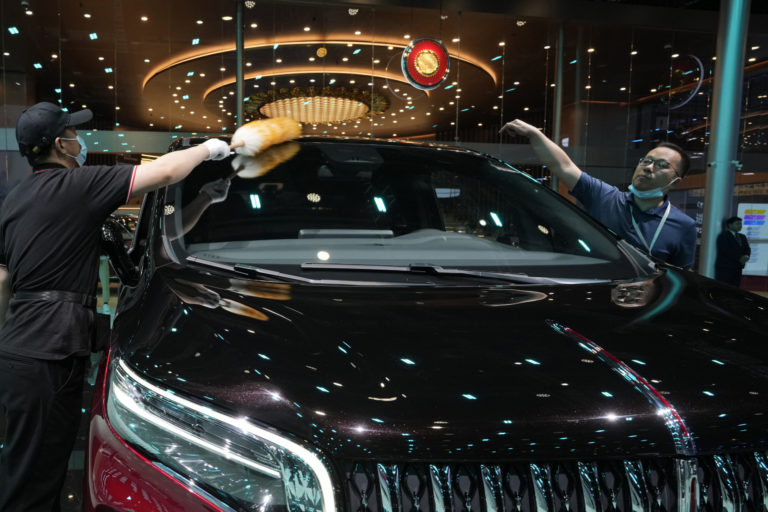Pracovníci čistia auto čínskej luxusnej automobilovej značky Hongqi vystavenej počas autosalónu Auto Shanghai 2023 v Šanghaji, v stredu 19. apríla 2023. Foto: SITA/AP, Ng Han Guan