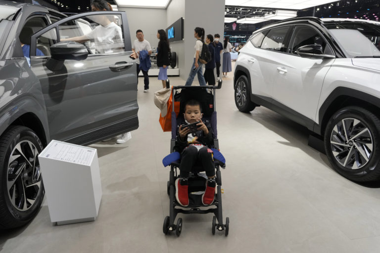 Dieťa sa hrá vo svojom kočíku medzi vystavenými autami počas autosalónu Auto Shanghai 2023 v Šanghaji. Foto: SITA/AP, Ng Han Guan